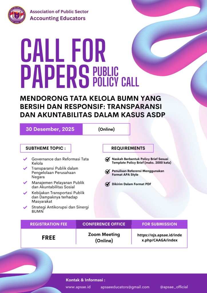 Sebagai wadah para pendidik, APSAE berkomitmen untuk terus mengembangkan khazanah keilmuan melalui riset yang berkualitas. Jelajahi berbagai jurnal terakreditasi, prosiding konferensi, dan buku referensi terbaru yang kami terbitkan sebagai sumbangsih bagi literatur akuntansi sektor publik di Indonesia.